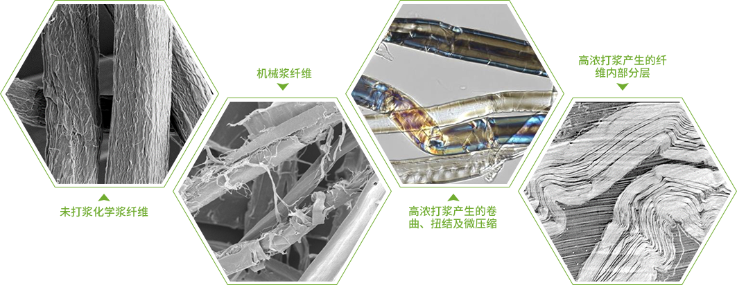 高濃打漿是指打漿過程中漿料通過濃縮設備將濃度提升至15%—25%,由螺旋輸送并強制喂入高濃磨機,在磨區依靠纖維之間相互 揉搓、擠壓和摩擦作用使得纖維分絲帚化的過程。